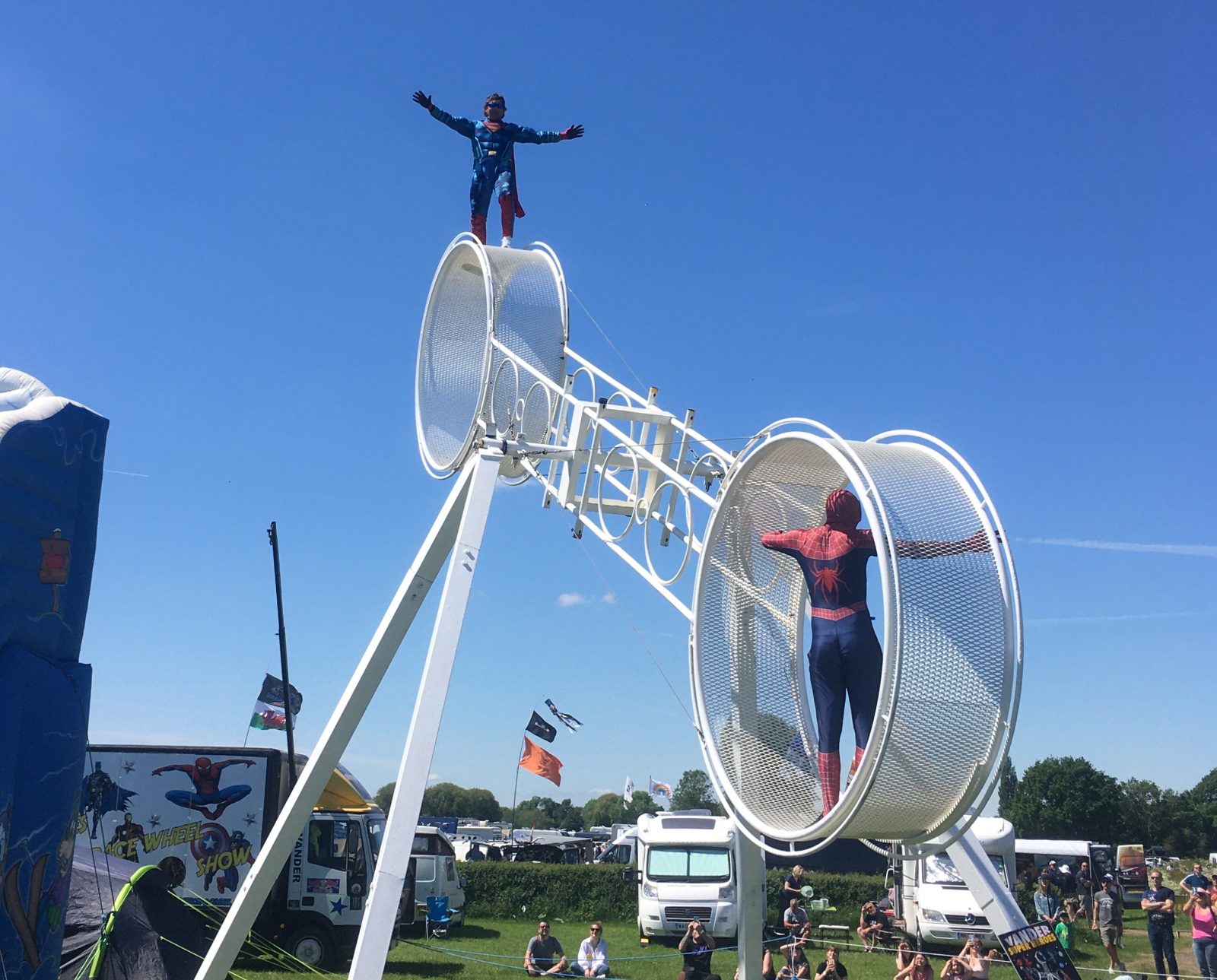 Two artistes will perform on the Vander Double Wheel of Death. Using only body momentum, the wheel spins as they perform blindfolded, juggling and skipping.